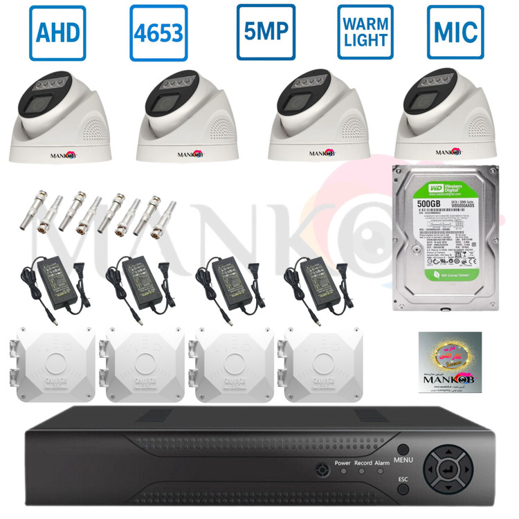 پکیج دوربین مداربسته ۴دوربین برد ۴۶۵۳hs رزولیشن 5مگاپیکسل بدنه پلاستیکی دید در شب رنگی میکروفندار