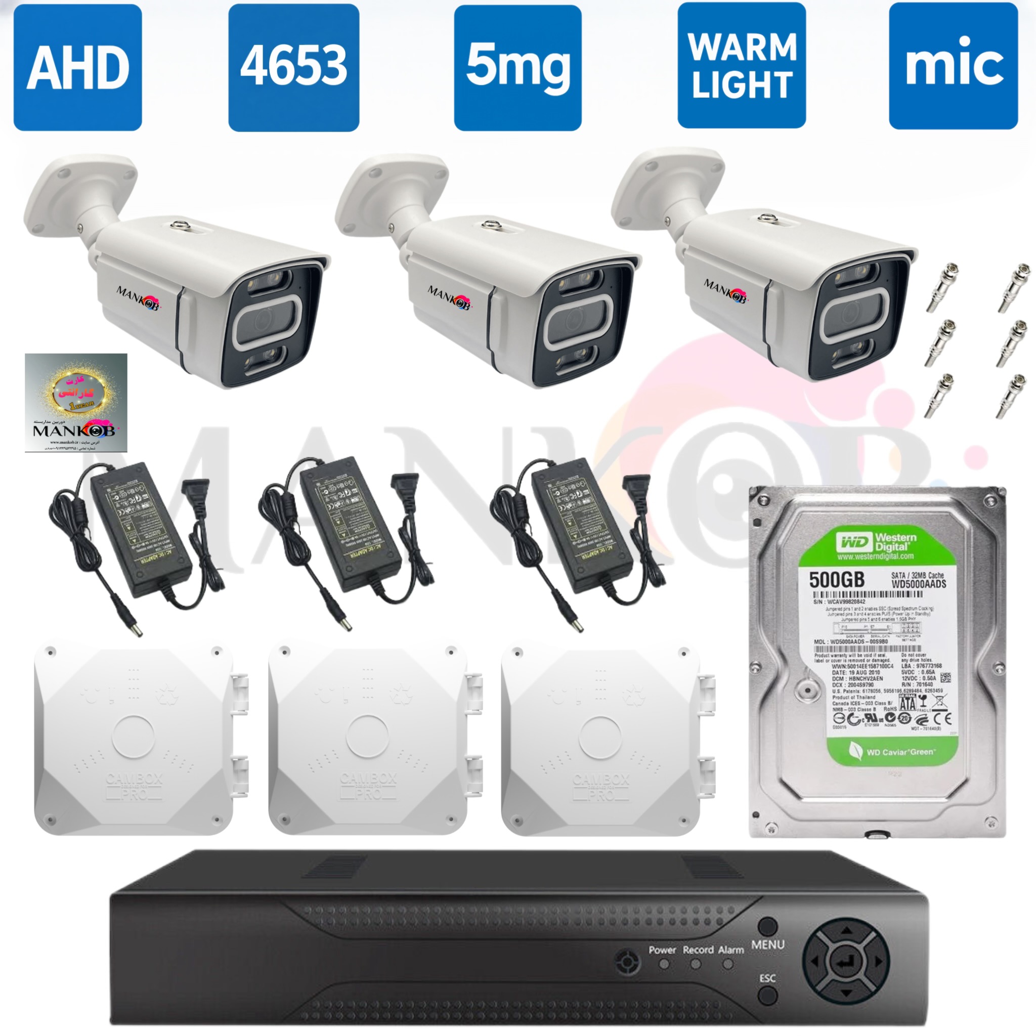 پکیج دوربین مداربسته 3دوربین AHD برد 4653hs رزولیشن 5مگاپیکسل بدنه فلزی دید در شب رنگی میکروفندار