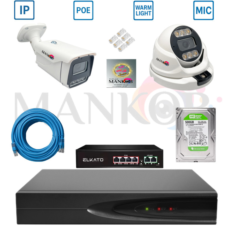 پکیج ip تحت شبکه poe دو دوربین برد h43 رزولیشن 4مگاپیکسل و لنز 5مگاپیکسل دید در شب رنگی میکروفندار بدنه فلزی